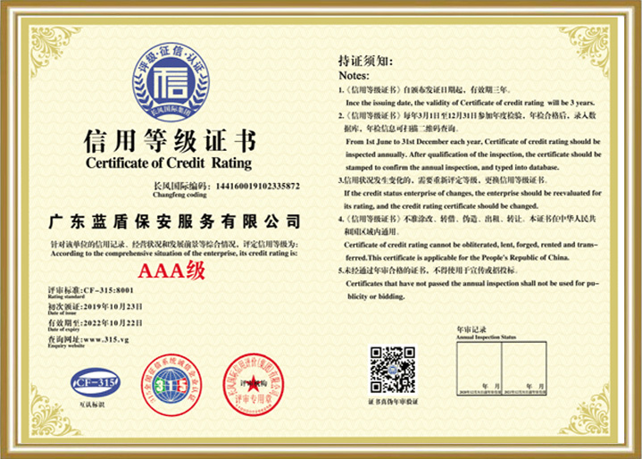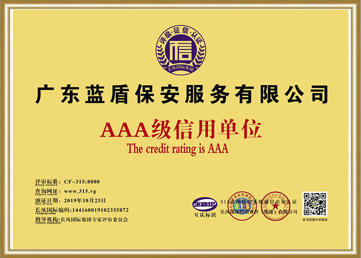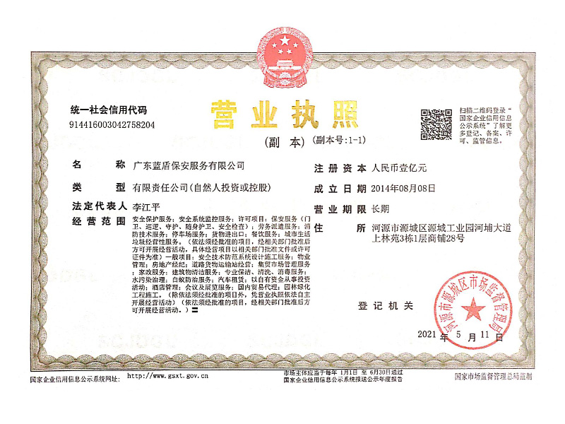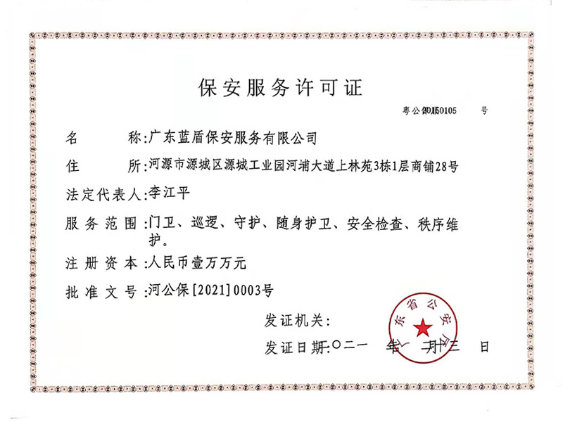 廣東藍盾保安服務有限公司經工商、公安機關批準成立,由于公司業務蓬勃發展,于2014年在廣東河源市成立廣東藍盾保安服務有限公司。公司實行市場化戰略,并著眼于未來,建立起現代保安企業管理制度,引入先進的運營理念和安全策略,以市場為導向,以滿足社會不同層次的安全需求為己任,開展多元化的保安服務業務。在激烈的市場競爭中,通過規范、專業的安防服務,贏得了客戶,贏得了市場,贏得了信譽。公司擁有大批行業精英和管理人才,經過幾年發展,逐步確立了以人力護衛為依托、以科技安防為導向、以職業培訓為基礎、以商務特保為特色的多元化經營發展模式